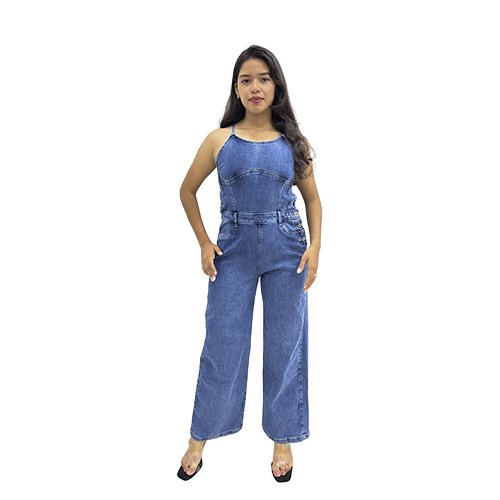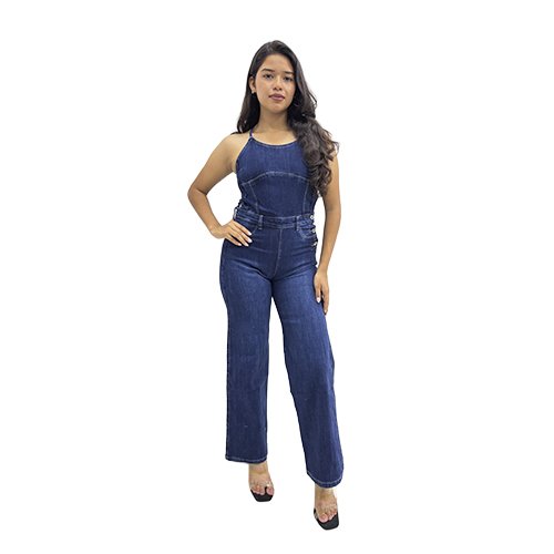 El Enterizo Jean Largo con basta ancha y detalle de espalda con cruce de tiras está diseñado para mujeres que buscan destacar con estilo. Su acabado semi-rígido proporciona un ajuste cómodo y moderno, ideal para resaltar tu figura.